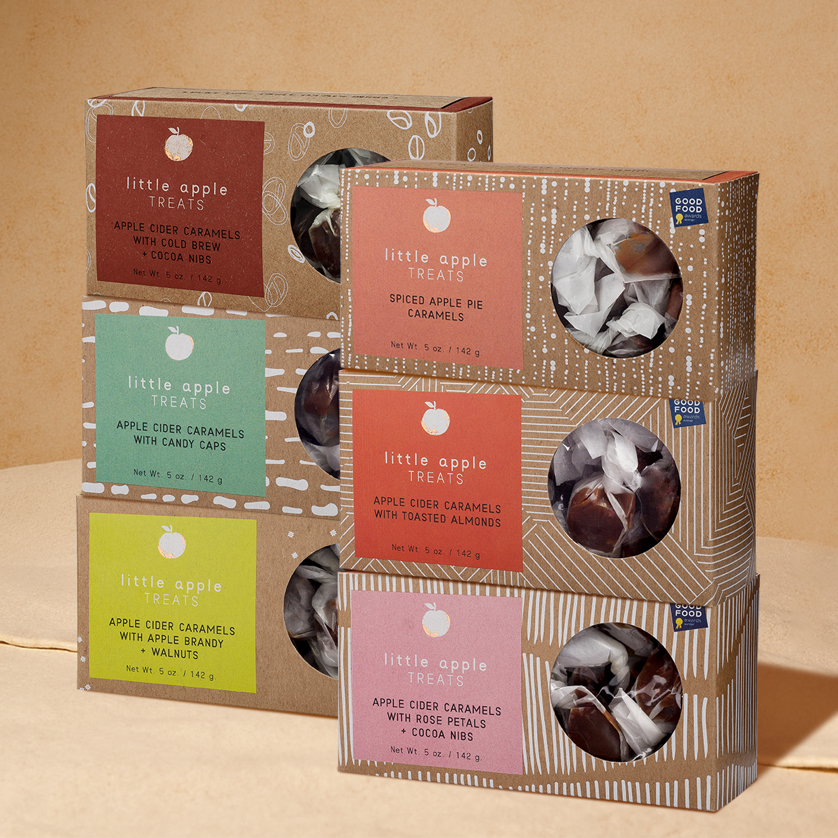 Includes: Spiced Apple Pie Caramels, Rose Petals + Cocoa Nibs Caramels, Apple Brandy + Walnuts Caramels, Candy Caps Caramels, Toasted Almonds Caramels, and Cold Brew + Cocoa Nib Caramels