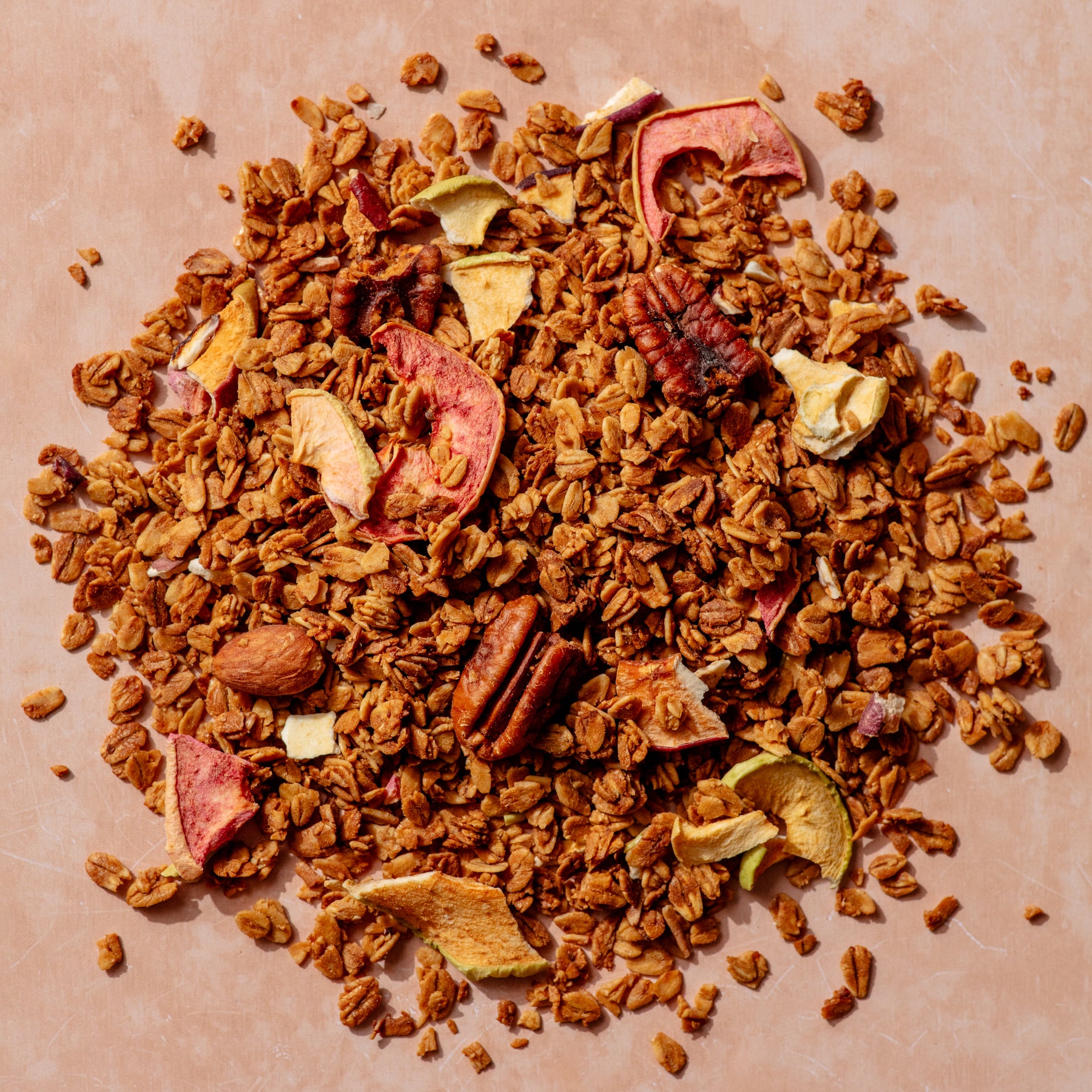 Picture of Little Apple Treats Hill + Hollow Granola, featuring dried heirloom apples such as Gravenstein and Pink Pearl, plus oats, pecan halves and almonds.